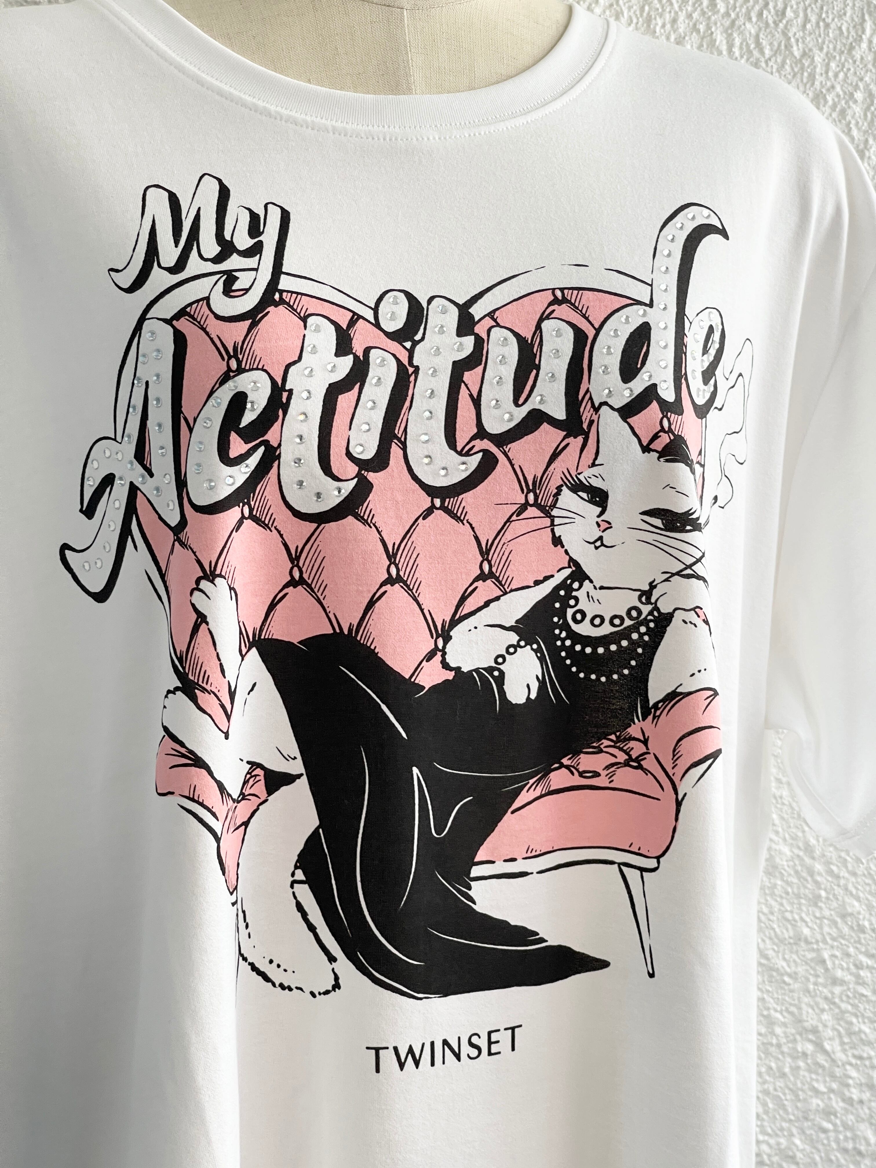 【TWIN SET】ビジュー付 CAT プリントオーバーサイズTシャツ
