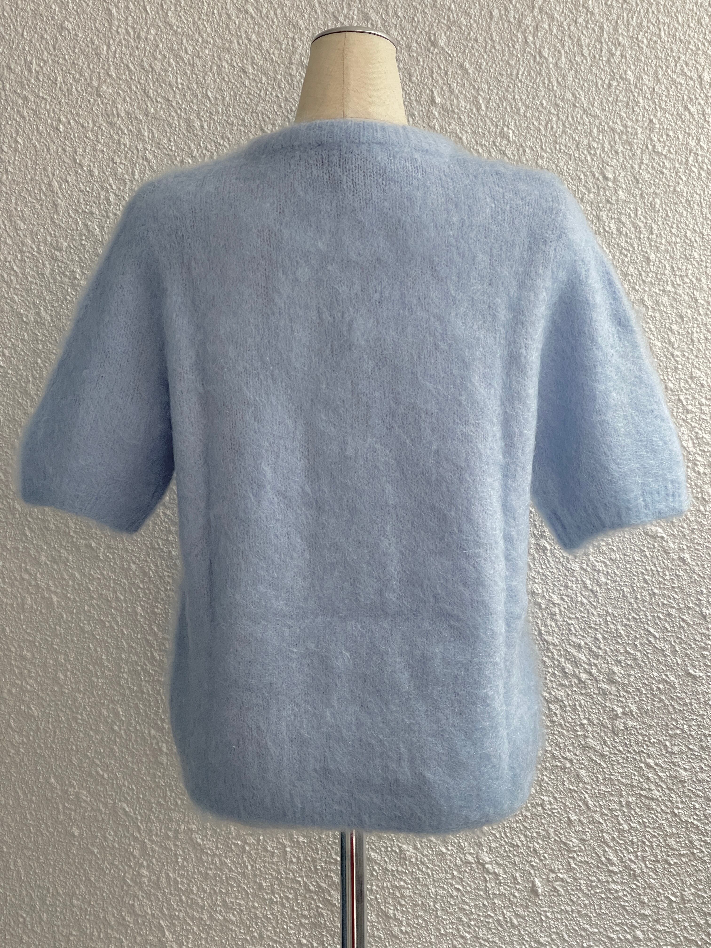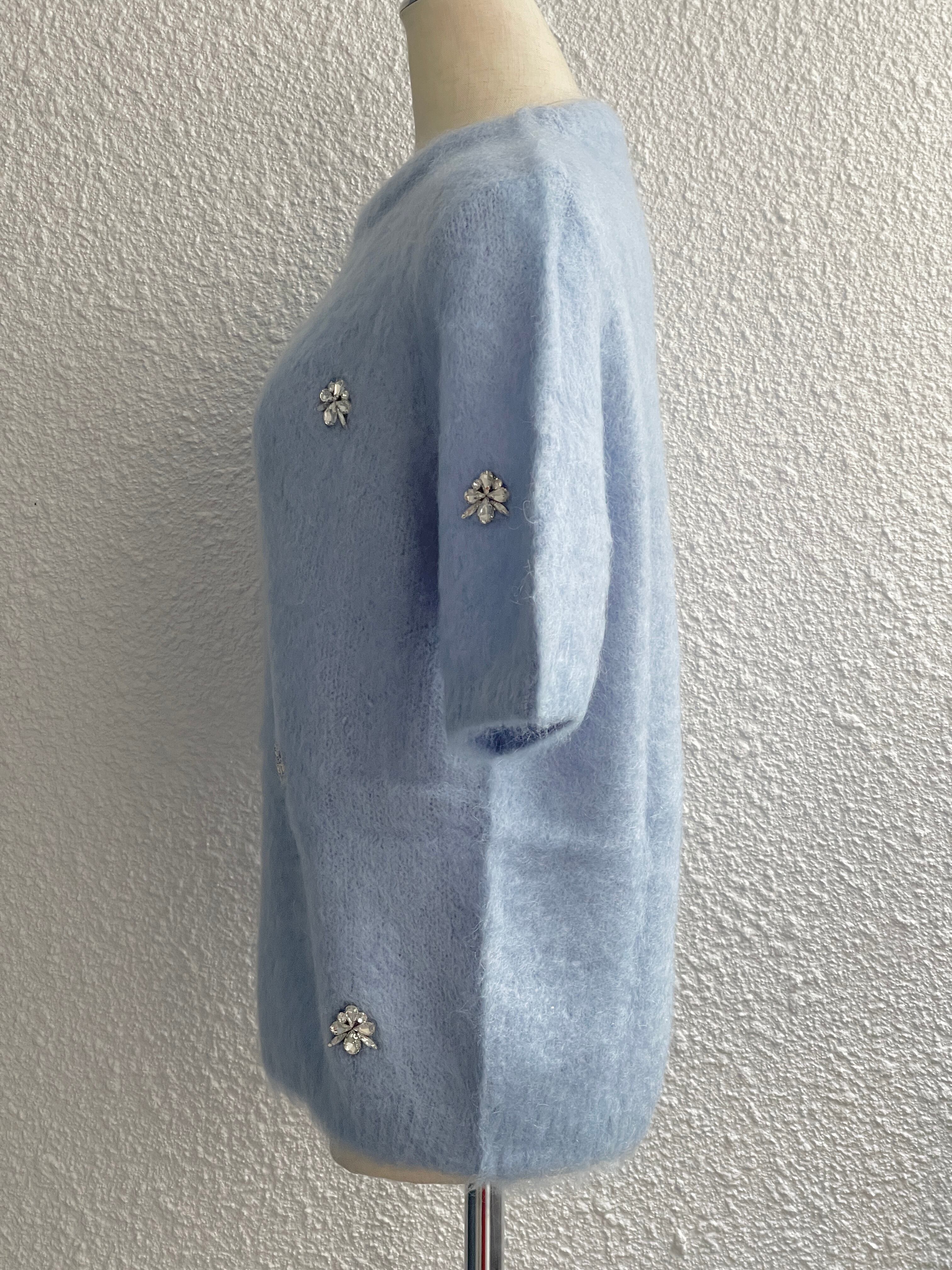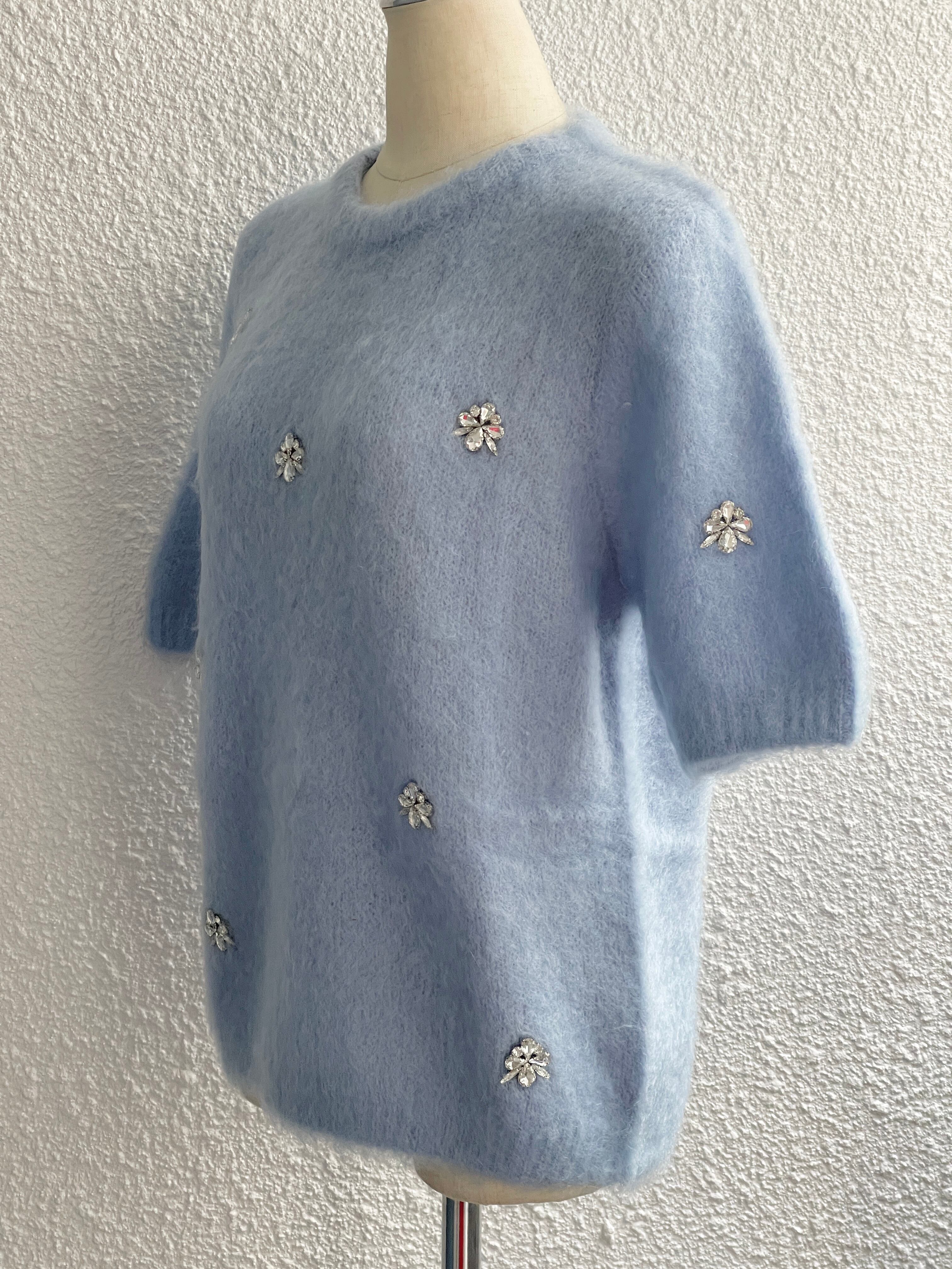 【Rinascimento】フラワービジュー付半袖モヘアニット(Blue)