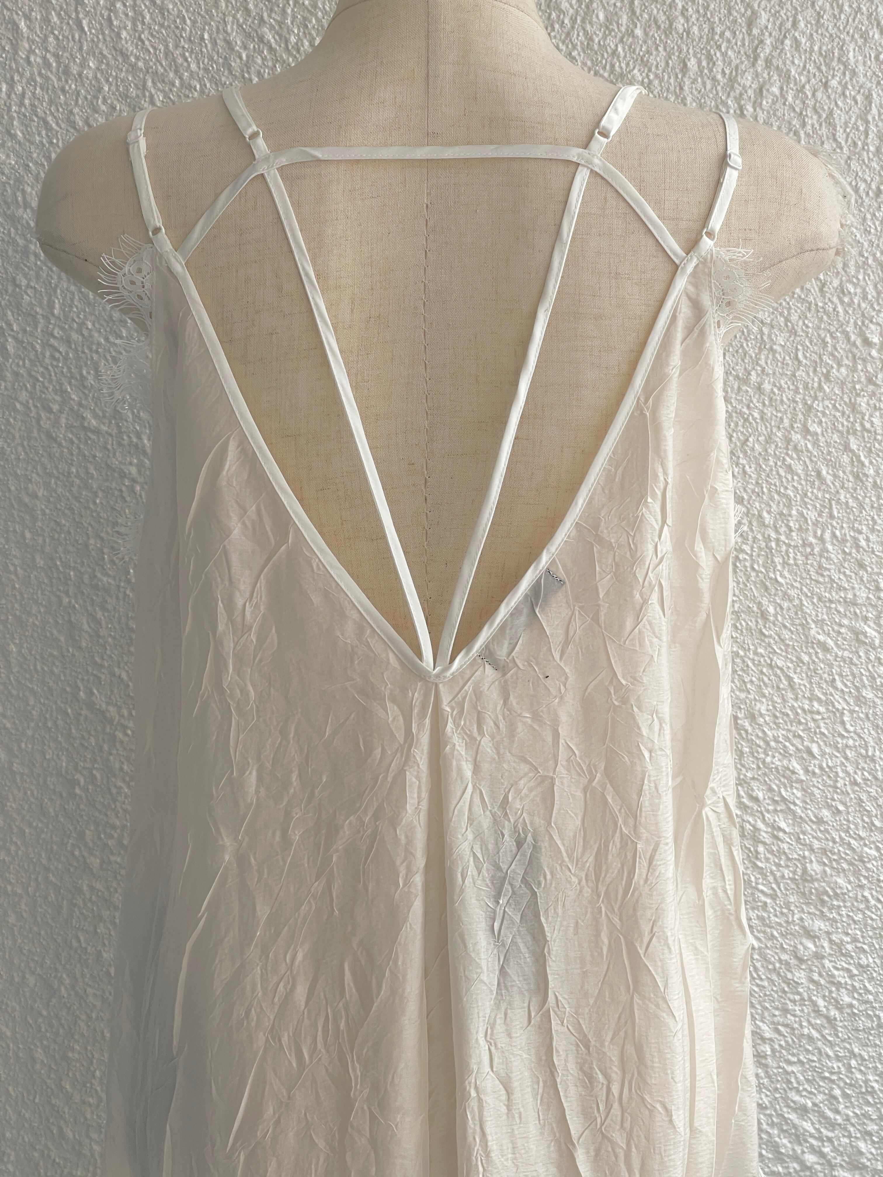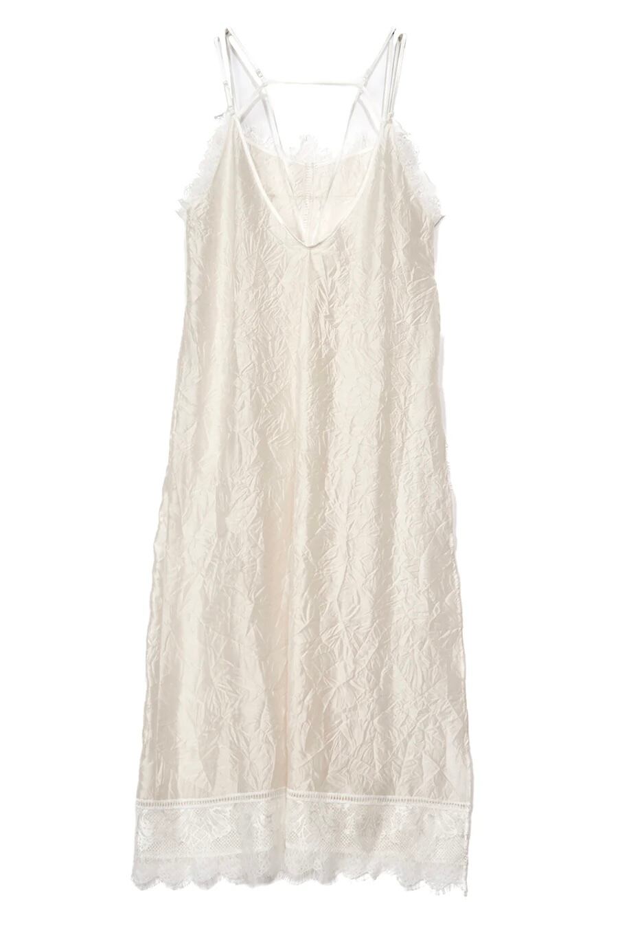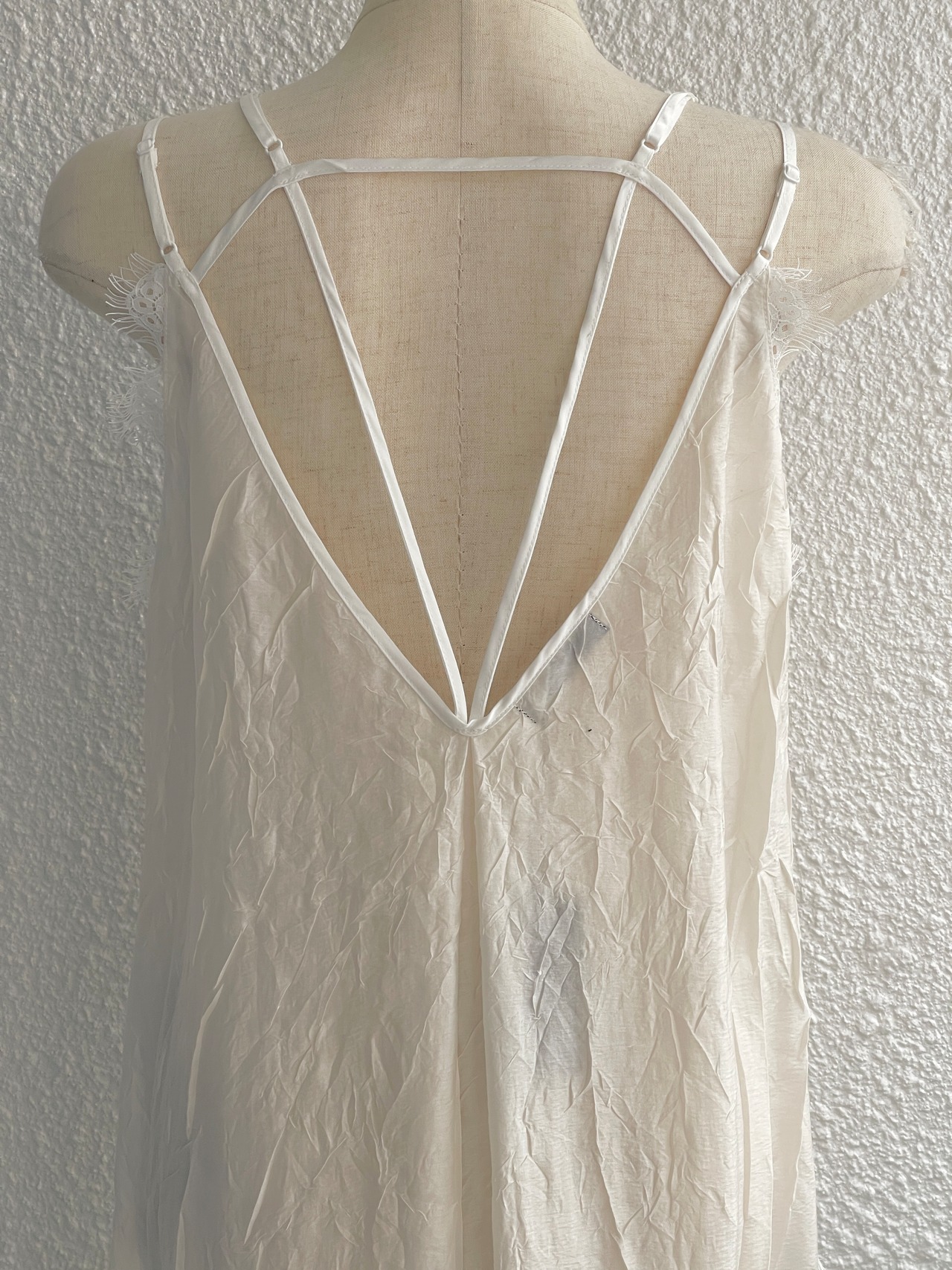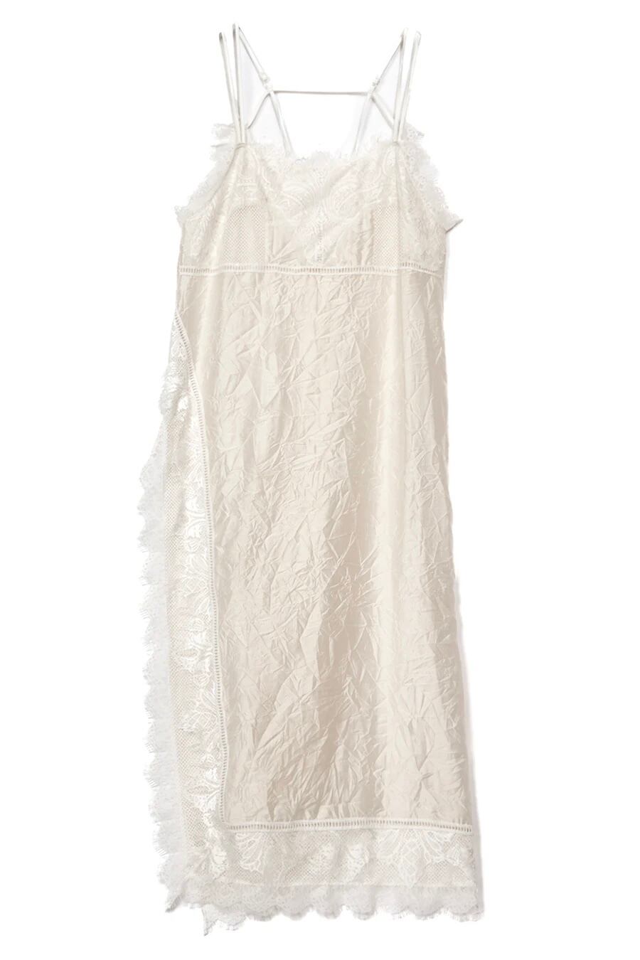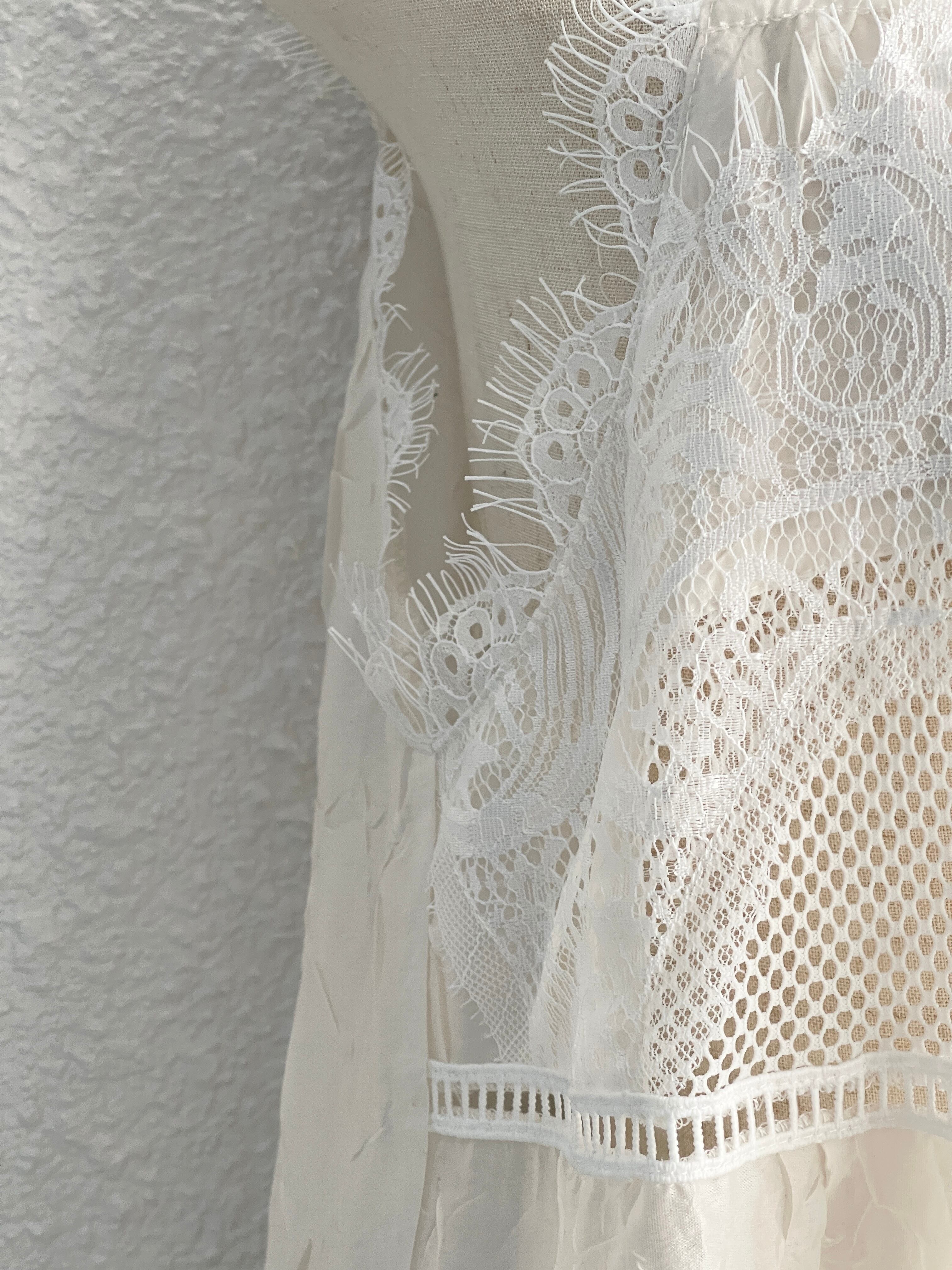 胸元に沿ってV型のモチーフリバーレースとメッシュを剥ぎ、