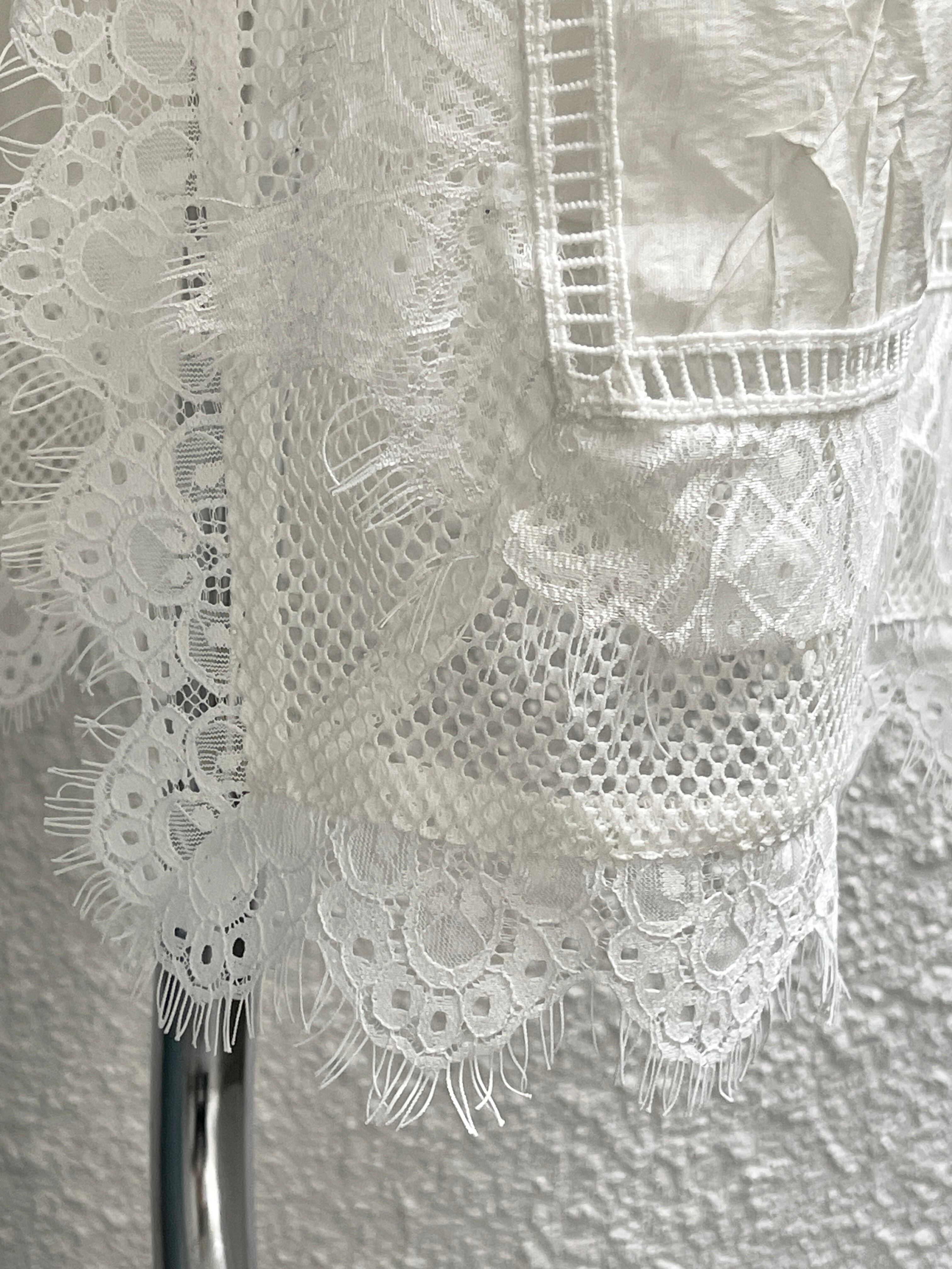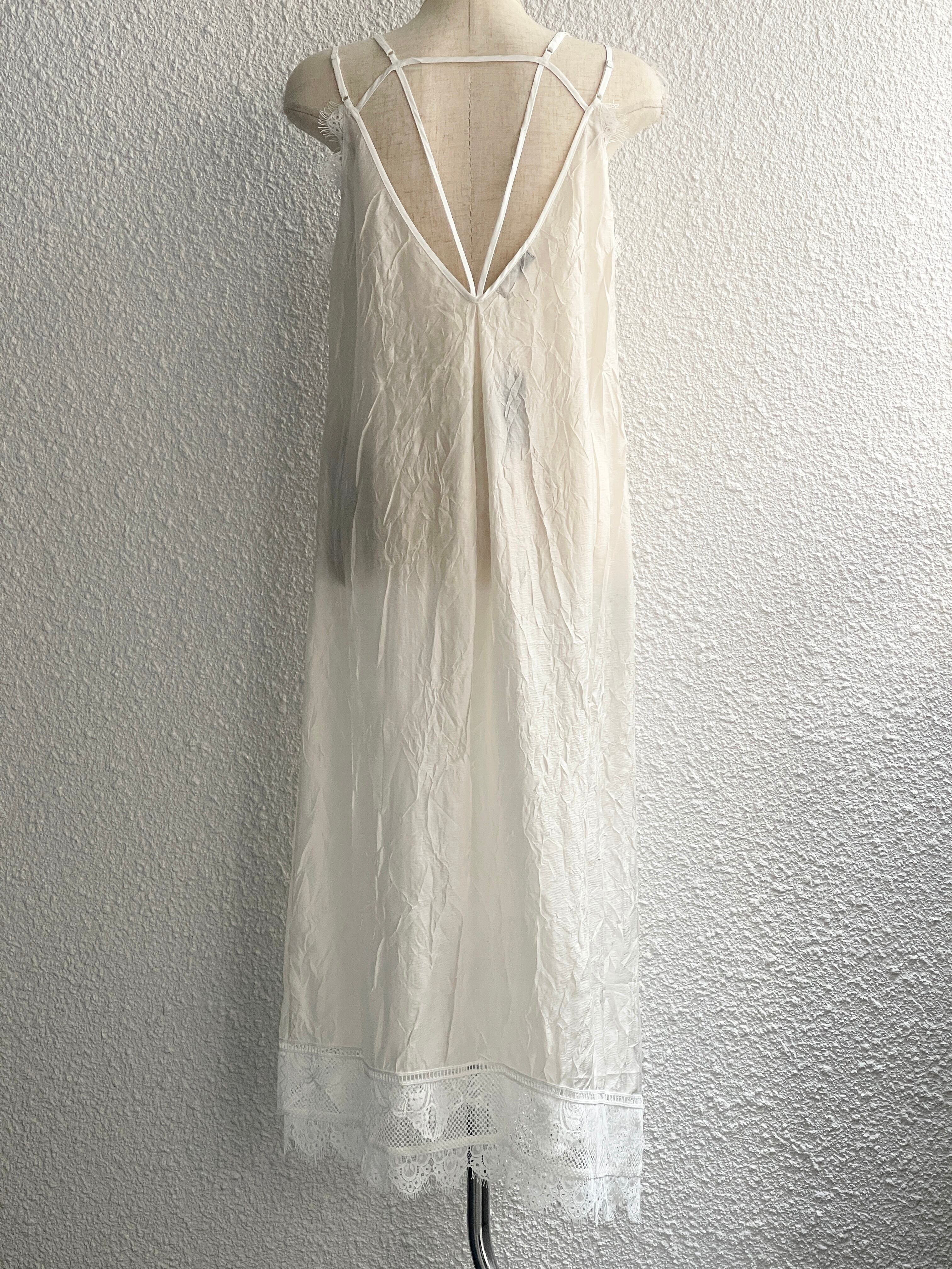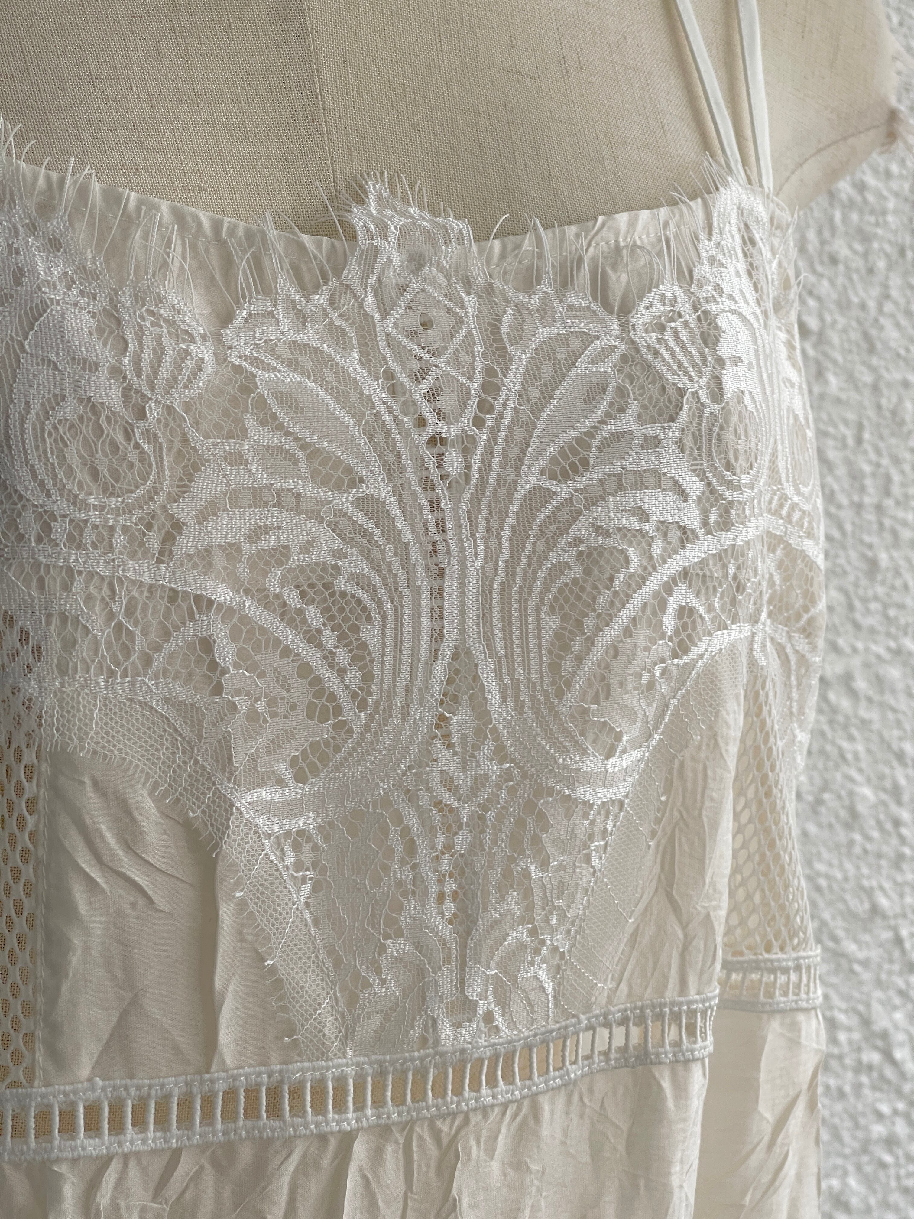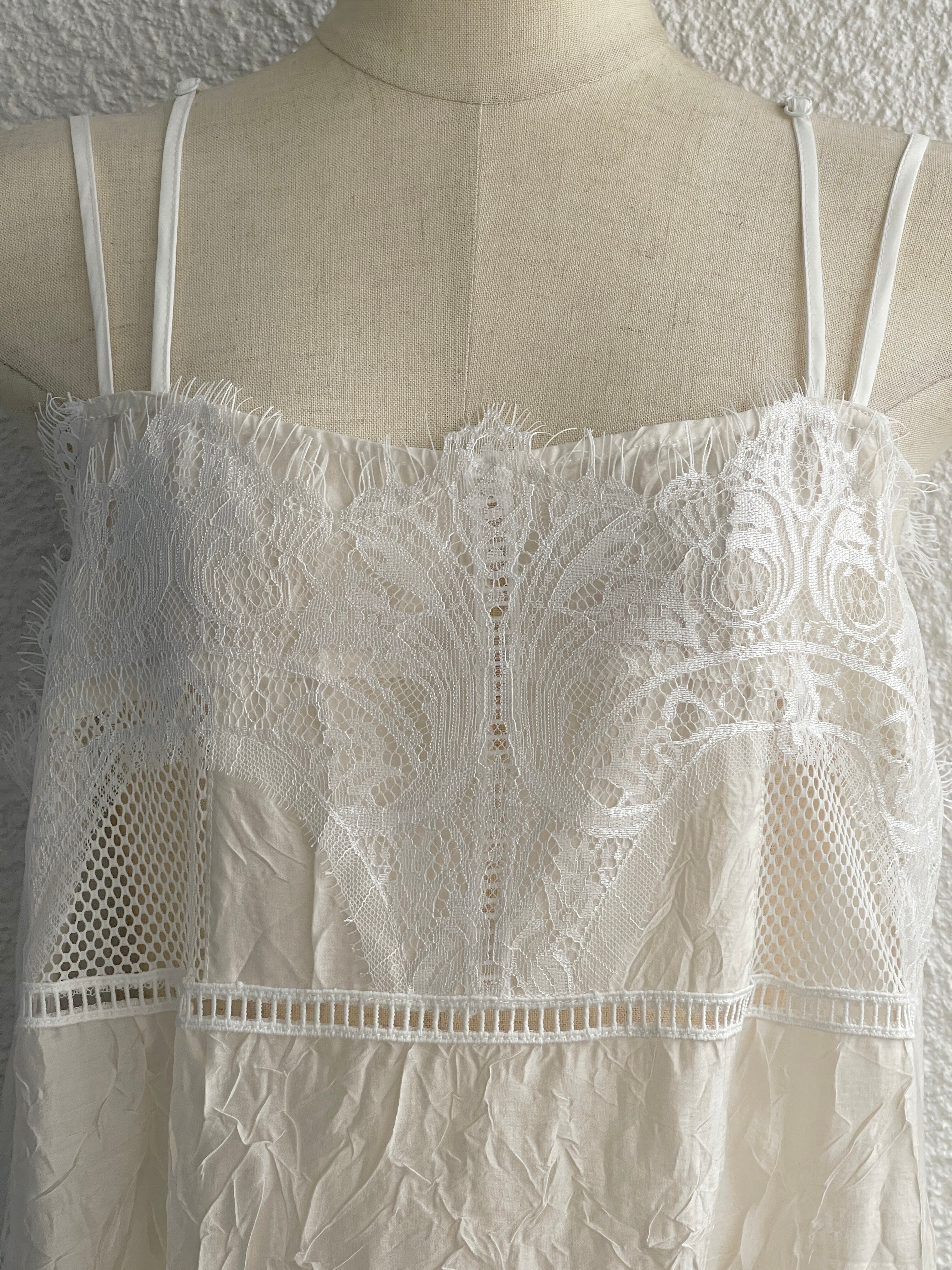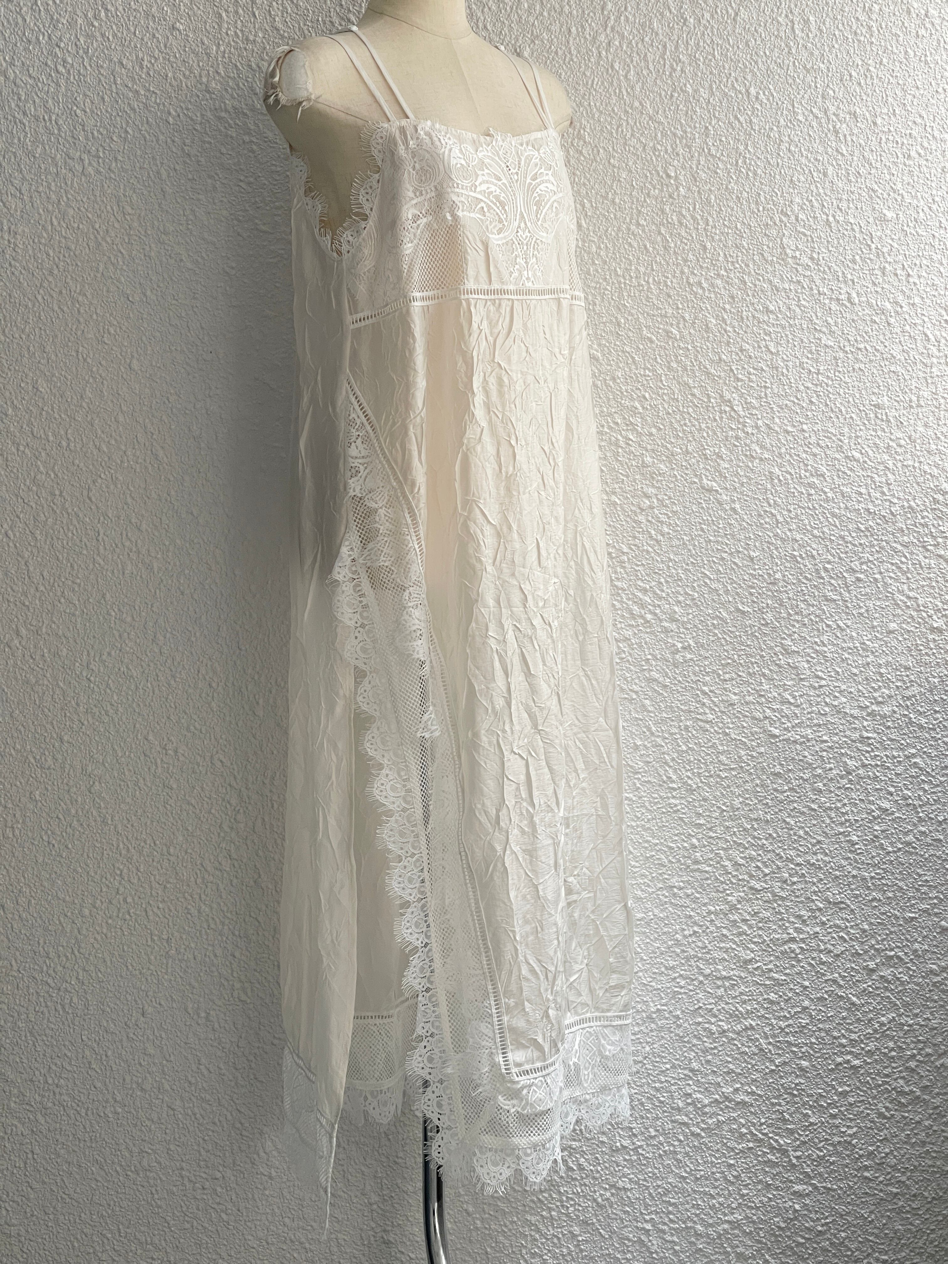 胸元に沿ってV型のモチーフリバーレースとメッシュを剥ぎ、