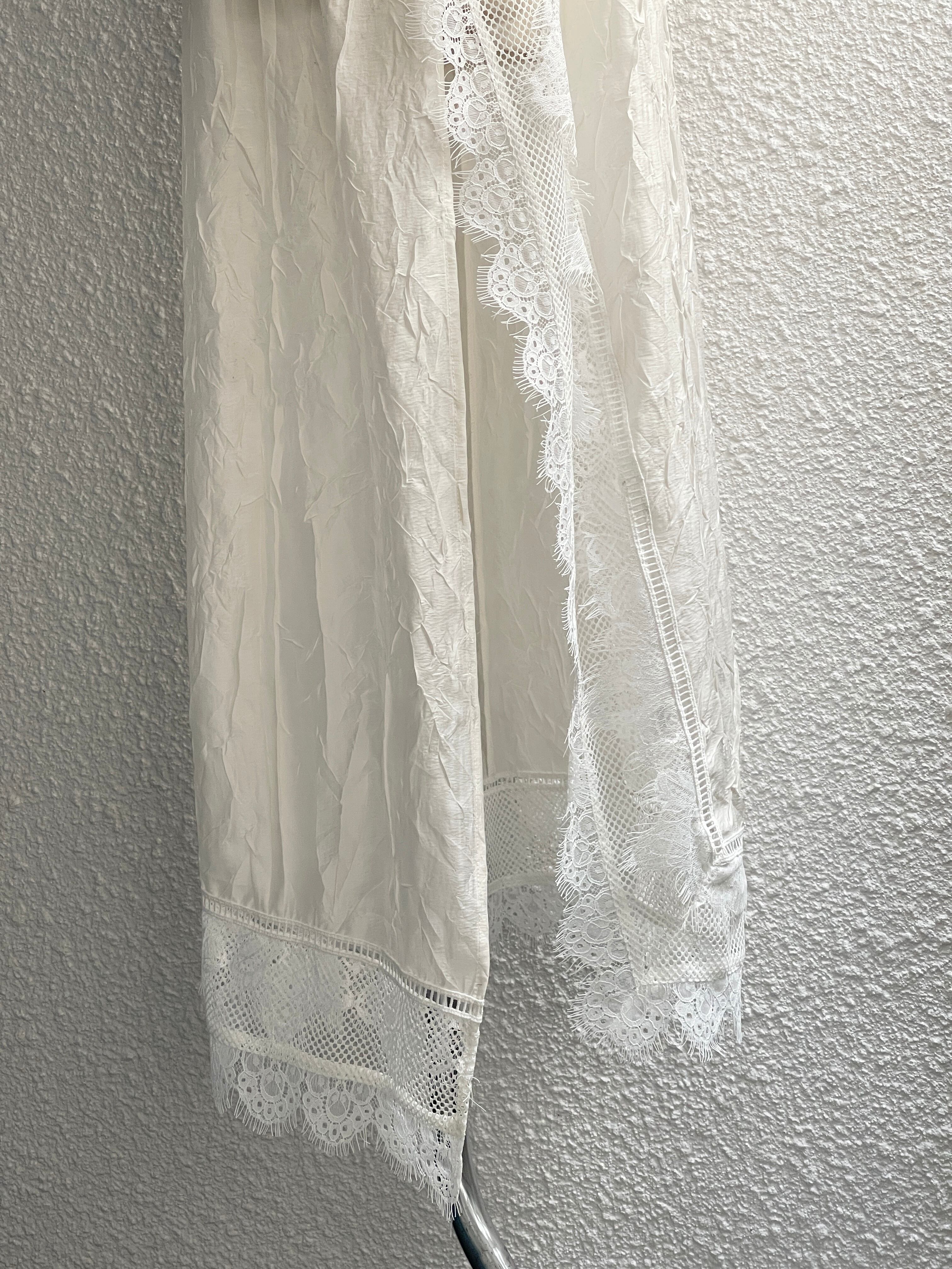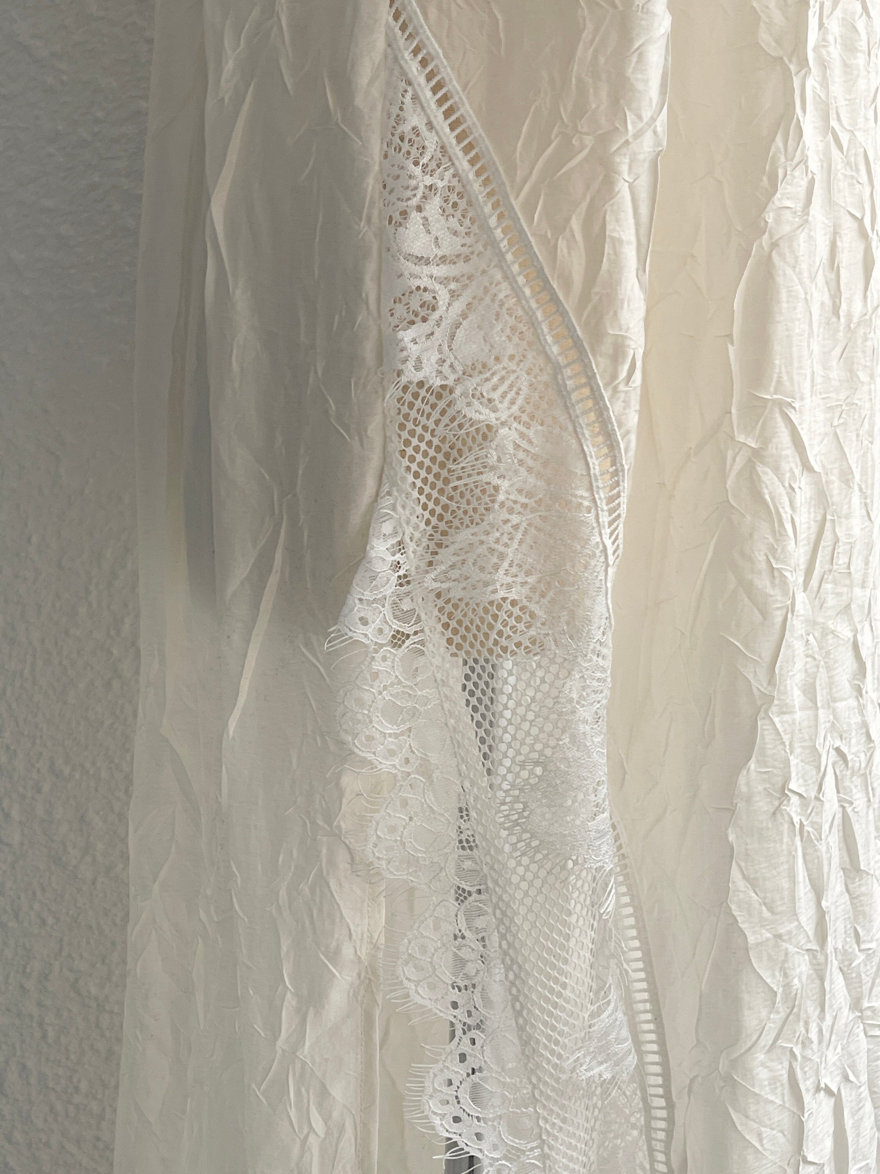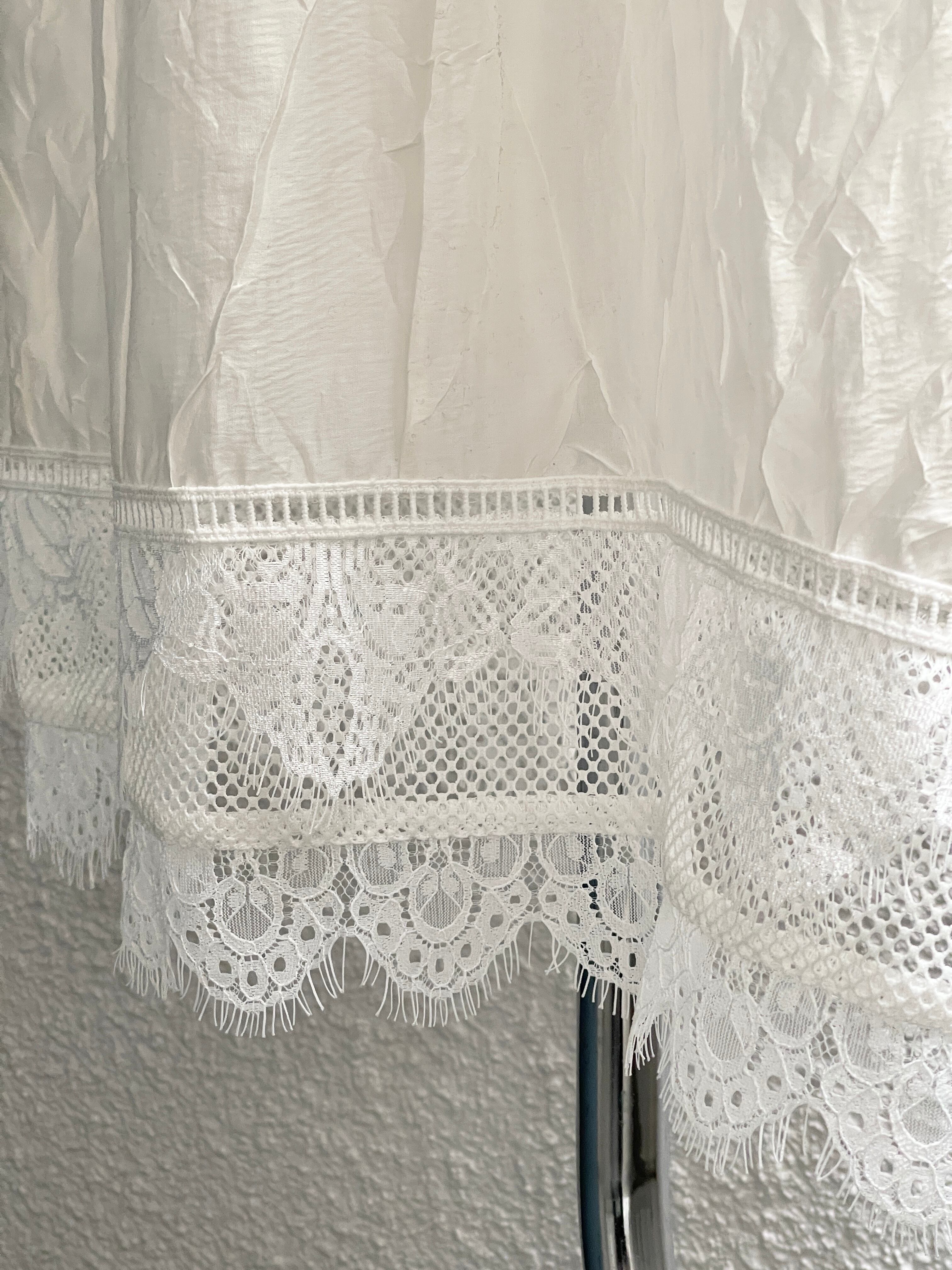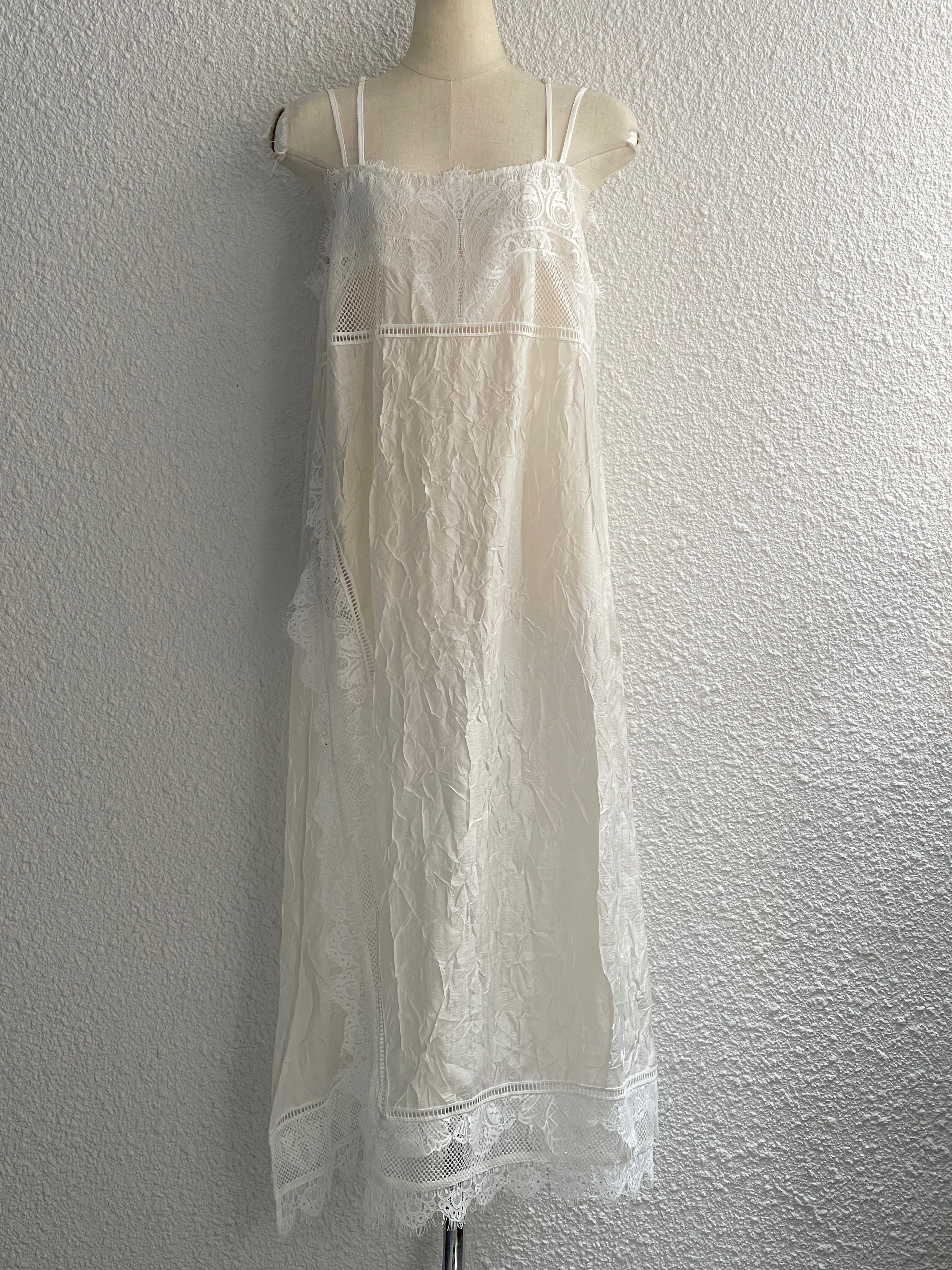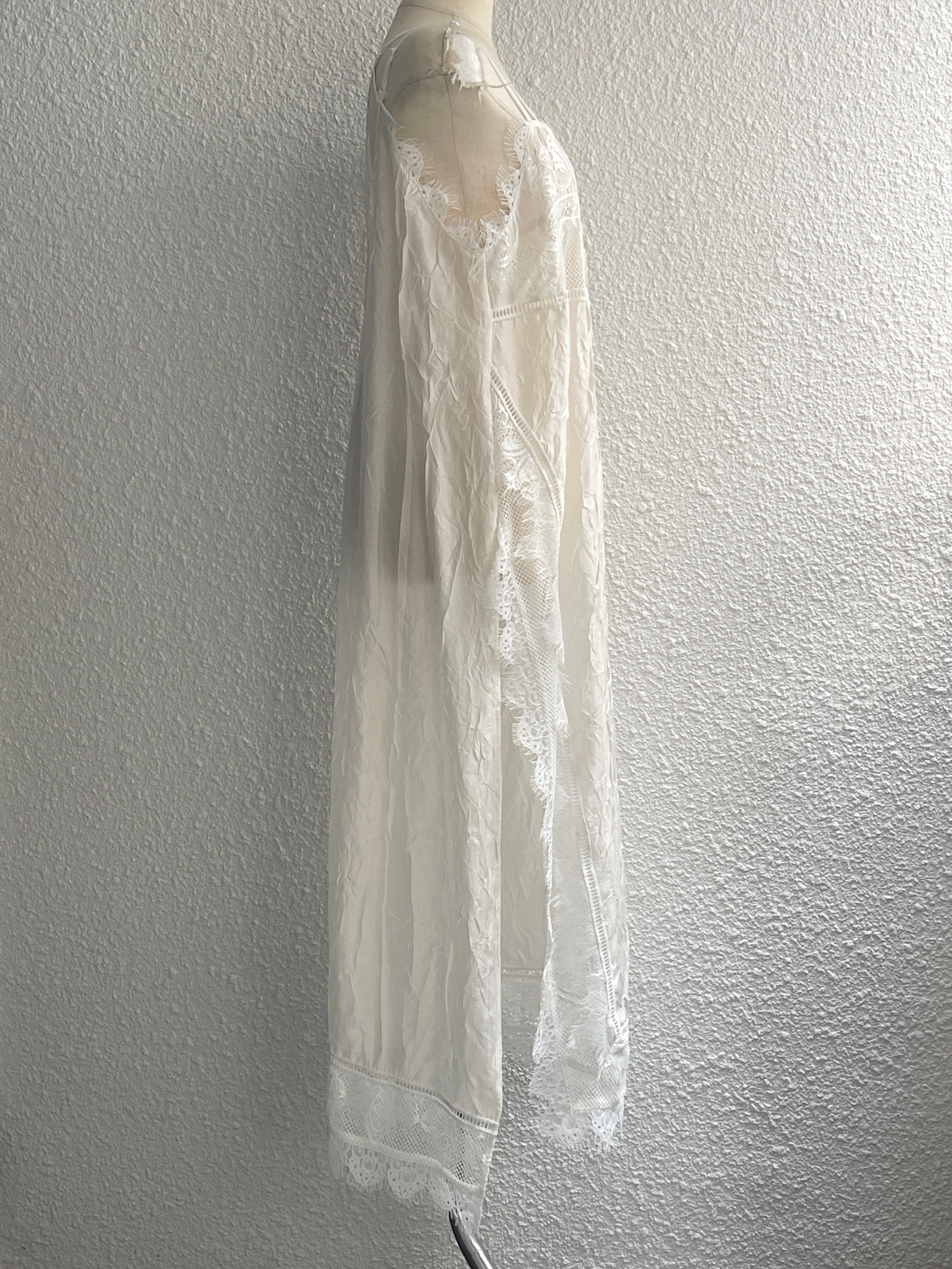 胸元に沿ってV型のモチーフリバーレースとメッシュを剥ぎ、